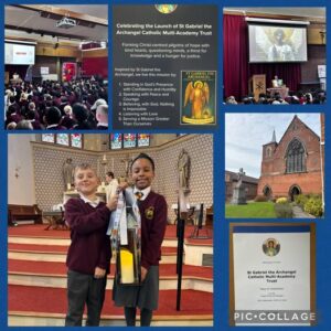 Yesterday, on the Feast of the Archangels we marked the official launch of St Gabriel the Archangel Catholic Multi-Academy Trust to which we belong. We gathered together yesterday morning and heard a special welcome message from Bishop Tim. Later staff, pupil representatives and our Chair of Governors joined 63 other schools in our Trust at a Mass of Celebration at St Austin’s Catholic Church is Stafford. They brought back a lamp, blessed by Canon Jonathon Veasey at the Mass. Our lamp unites us with each school in the Trust. May each shine brightly and we all be messengers of hope!